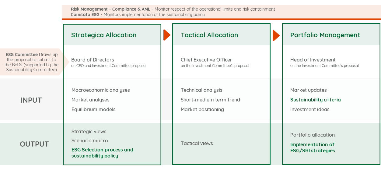 Consistently with European law (Regulation EU 2019/2088, so-called Sustainable Finance Disclosure Regulation), Eurizon has adopted a Sustainability policy that illustrates how sustainability risks are integrated in the investment decision process, defining specific methodologies to select and monitor financial instruments, that take into account sustainable and responsible investment (SRI) principles, and environmental, social, and governance (ESG) factors.