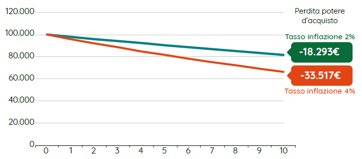 A puro scopo illustrativo. Fonte: Elaborazione interna Eurizon. Nella simulazione, la linea verde rappresenta la perdita del valore reale di 100.000 euro in 10 anni ipotizzando un tasso di inflazione al 2%; la linea arancione rappresenta la perdita del valore reale di 100.000 euro in 10 anni ipotizzando un tasso di inflazione al 4%.