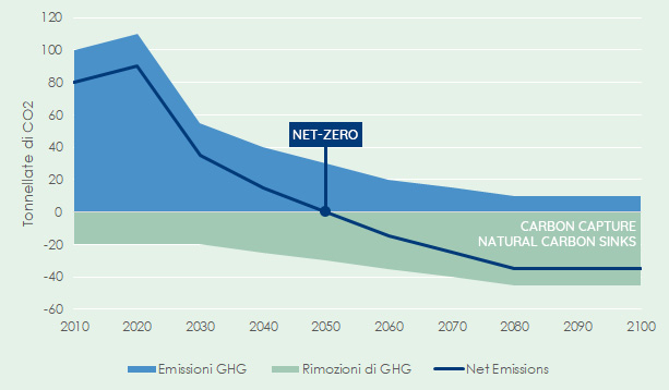 L’Accordo di Parigi e le intese successive sul tema della tutela del nostro pianeta hanno messo in evidenza la necessità di ridurre da subito le emissioni di gas serra per raggiungere la neutralità climatica (Net Zero) entro il 2050. I gas a effetto serra emessi nell’atmosfera dovranno quindi progressivamente ridursi tramite tecniche di efficientamento dei processi produttivi ed essere riassorbiti principalmente attraverso nuove tecnologie di cattura e stoccaggio e in maniera residuale da risorse naturali quali foreste, suolo e oceani (carbon sink*).