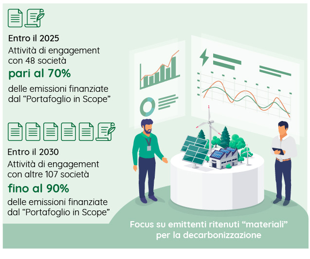I primi due target potranno essere raggiunti attraverso l’attività di dialogo (cd. engagement) con le società partecipate per incentivarle a intraprendere percorsi di decarbonizzazione dei propri business e, progressivamente, allinearsi allo scenario Net Zero.